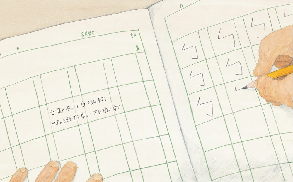 《注音練習》為作者林儀獲得第十四屆林榮三文學獎.新詩獎【首獎】詩作,今年獲得義大利波隆那插畫展入選畫家-薛慧瑩,以細膩的筆觸、富有細節的圖像,刻劃了辛苦一輩子的母親,展現動人的情感。讀者不僅可以單獨讀詩,亦可單獨讀畫,兩者結合讀之,更能明白一個母親如何犧牲自己,到開始學習,期待活出不一樣的自己。