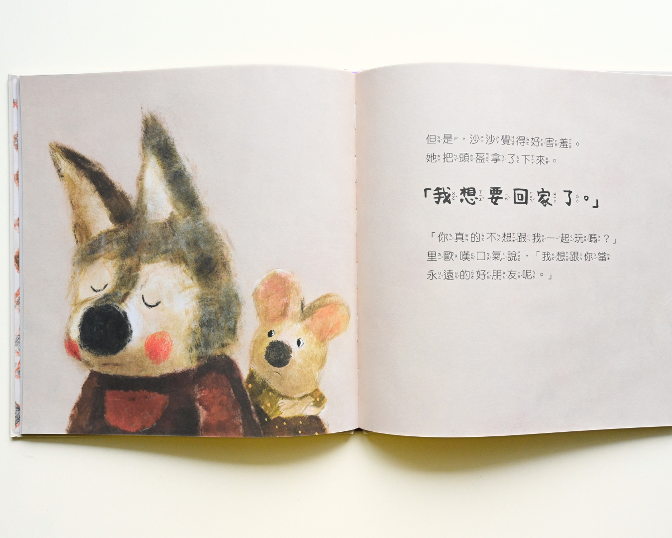 「其實想交朋友,但實在太害羞了」沙沙受邀去朋友家玩,他好緊張好緊張,緊緊拽著媽媽(媽媽可以不要走,一直陪著我嗎?)。好朋友擺出了廚房、音樂舞蹈各種遊戲款待,沙沙好想一起玩,但不知道怎麼回應「一起玩」的邀請⋯⋯一本寫 兒童社交焦慮與內向情緒 的繪本,如果家裡也有一個有時手足無措的孩子,沒關係,不是只有你覺得緊張,用溫柔的故事接住內向孩子的小心情。
