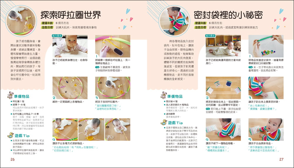 書中所有遊戲都涵蓋建議月齡、示範步驟、遊戲目標、延伸變化,也提供依照孩子的發育狀況,階段性調整遊戲難易度的方法。不論是對居家育兒的家長,或是教育前線的教職人員而言,都是一本可以翻開立刻實踐、充滿樂趣的「遊戲大百科」!